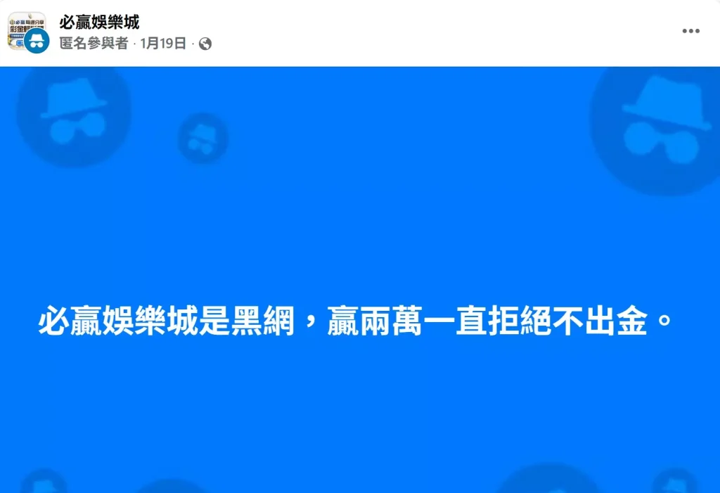 只要你有在逛娛樂城相關的FB社團、Telegram群或論壇,一定看過那種很情緒化的貼文「大家不要玩必贏娛樂城,黑網故意不出金。」再附一張出金遭拒的截圖,看起來好像真的很嚴重,但仔細一看,往往會發現幾個很關鍵的問題:沒有時間軸、沒有操作過程、沒有後續結果,甚至還是匿名帳號發文,讓整件事變得非常模糊。
