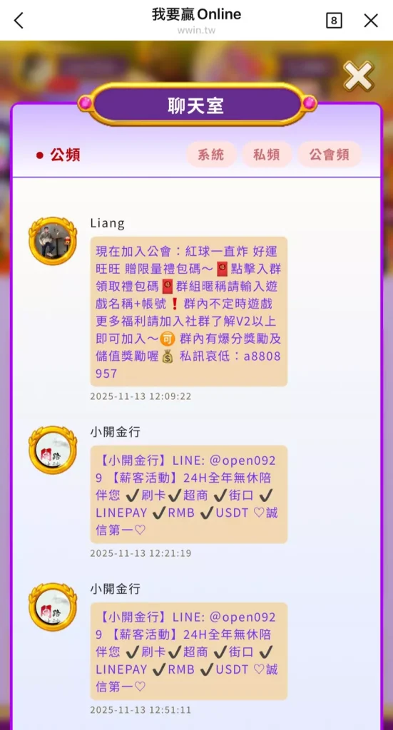 只要有玩過我要贏Online的人,大概都對遊戲大廳裡的「公頻聊天」印象深刻。本來以為公頻存在的目的,是讓玩家交流遊戲心得、分享中獎畫面、討論活動資訊,甚至建立社群氣氛。但實際進到公頻後就會發現,真正最活躍的往往不是玩家,而是一批每天瘋狂洗版招募的公會幣商。