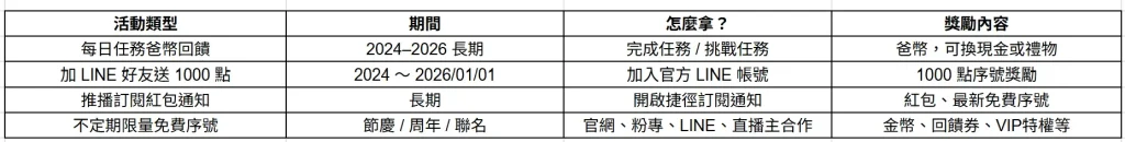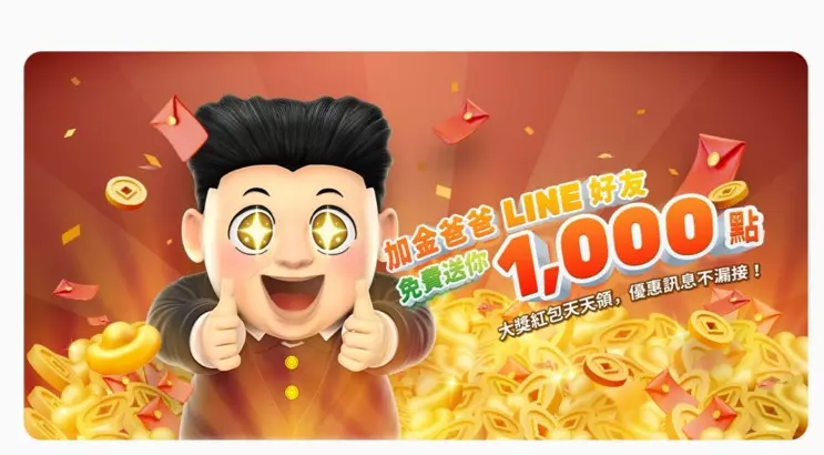 除了每日任務外,最受玩家歡迎的莫過於加金爸爸LINE好友送1000點活動。只要把官方帳號加進好友名單,就能立即獲得獎勵,而且還能第一時間收到紅包、優惠、折扣碼等推播訊息,完全不怕錯過任何免費序號或限時活動。